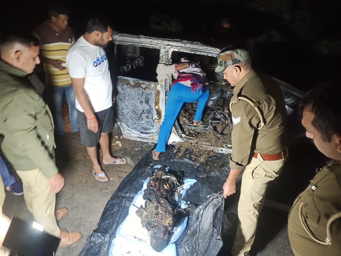 सडक पर दौड़ती कार बनी आग का गोला, कार सवार युवक जिन्दा जला.. महिला सहित 3 झुलसे