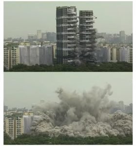 नोएडा। यहाँ सुप्रीम कोर्ट के निर्देश पर ट्विन्स टॉवर यानी महज 9-12 सेकेंड में कुतुब मीनार से भी ऊंची इमारतें स्वाहा हो गईं। कुतुब मीनार से भी ऊंची इमारत के ढहने से आसमान में धूल का गुबार दिखाई दिया। टावर के ध्वस्तीकरण के लिए करीब 9640 छेद में 3700 किलो विस्फोटक का प्रयोग किया गया था। मौके पर पुलिस से लेकर एनडीआरएफ, एंबुलेंस, फायर ब्रिगेड की टीमें मौजूद रही। वहीं वायु प्रदूषण को रोकने के लिए पानी के टैंकर मौजूद हैं जिनसे पानी का छिड़काव किया गया। एंटी स्मॉग गन भी लगाई गई हैं।