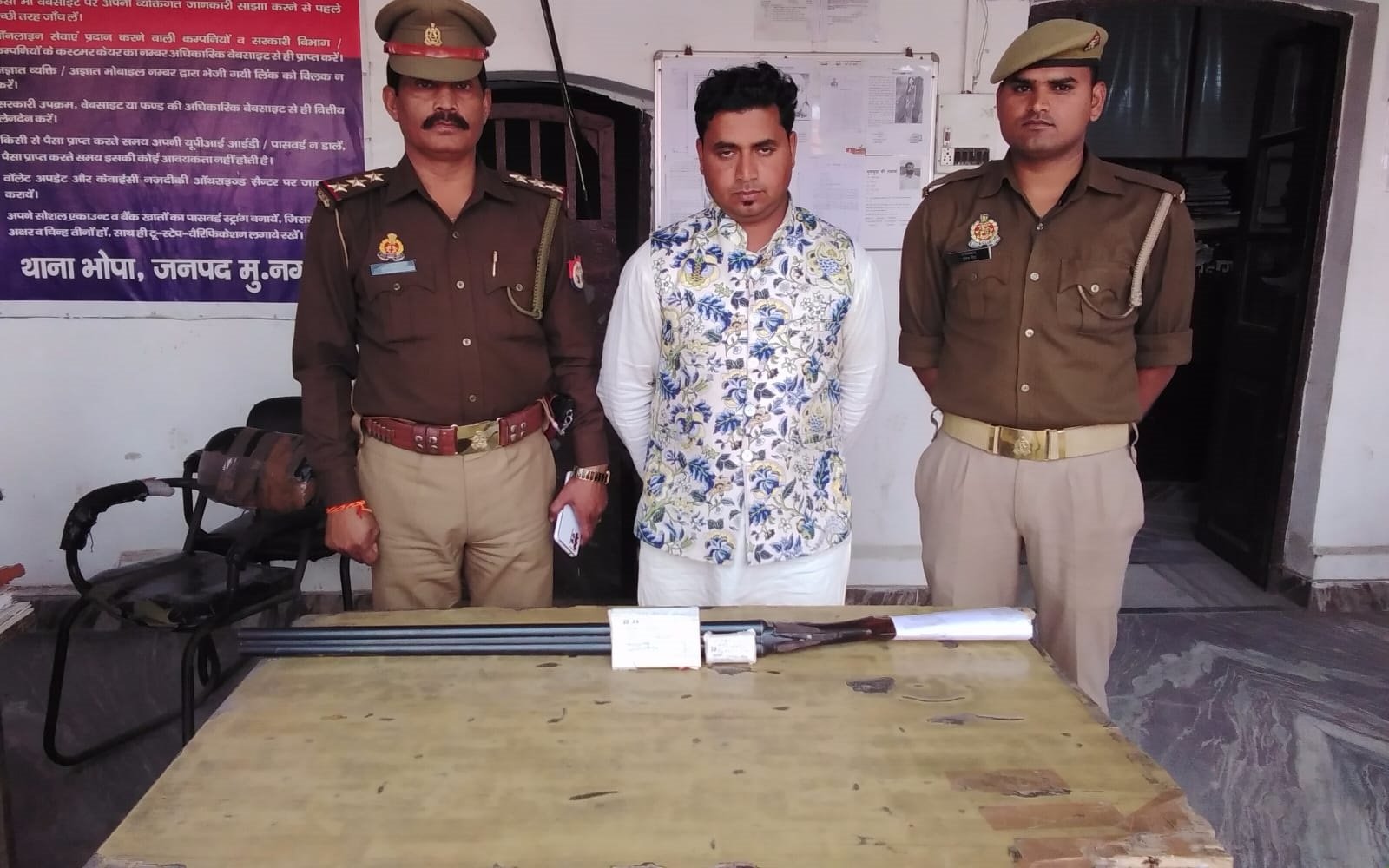 मुजफ्फरनगर के भोपा थाना क्षेत्र के संवेदनशील गांव में सरेशाम फायरिंग करने के आरोपी को पुलिस ने गिरफ्तार कर लिया। पुलिस ने आरोपी से लाइसेंसी बंदूक व दो खोखा कारतूस बरामद कर उसे जेल की हवा खिलाई है। सूत्रों के अनुसार आरोपी के परिवार में कुछ दिन पूर्व एक घरेलू कार्यक्रम आयोजित हुआ था जिसके चलते आरोपी रौब ग़ालिब करने के लिए खुलेआम फायरिंग कर रहा था।
