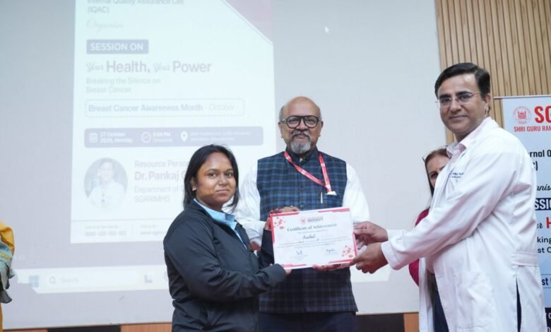 स्तन कैंसर जागरूकता माह के अंतर्गत, श्री गुरु राम राय विश्वविद्यालय के आंतरिक गुणवत्ता आश्वासन प्रकोष्ठ (IQAC) द्वारा पोस्टर मेकिंग प्रतियोगिता एवं अतिथि व्याख्यान का आयोजन किया गया। इस कार्यक्रम का उद्देश्य छात्रों और अध्यापकों में स्तन कैंसर के प्रति जागरूकता बढ़ाना और समय पर जाँच एवं आत्म-परीक्षण के महत्व को समझाना था।