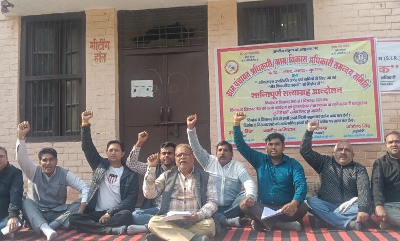 ऑन लाईन हाजरी के विरोध मे उतरे ग्राम सचिवों ने दिया धरना