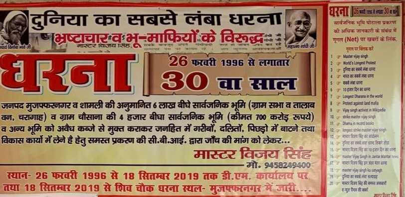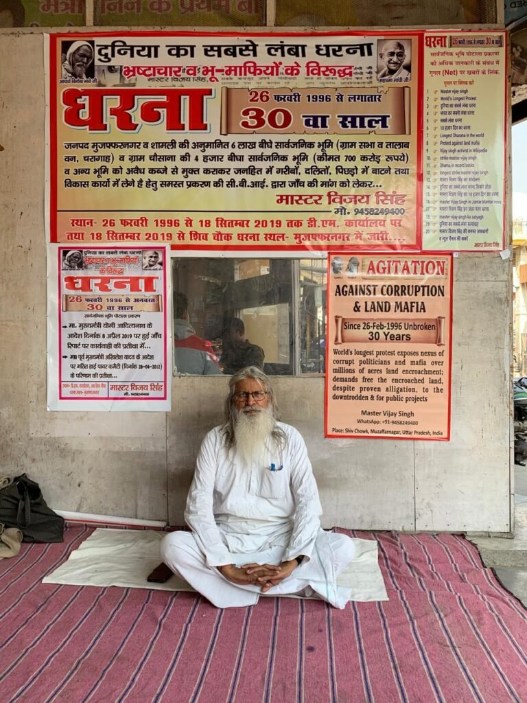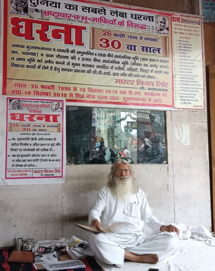मुजफ्फरनगर। भ्रष्टाचार व भू-माफियाओं के विरुद्ध 26 फरवरी 1996 को जिलाधिकारी कार्यालय पर शुरू हुआ मास्टर विजय सिंह का सत्याग्रह आज 30 वर्ष पूरे कर गया। ग्राम चौसाना की लगभग चार हजार बीघा सार्वजनिक कृषि भूमि (अनुमानित कीमत करीब 900 करोड़ रुपये) तथा मुजफ्फरनगर-शामली की लगभग 6 लाख बीघा ग्रामसभा, तालाब, वन व बंजर भूमि को अवैध कब्जों से मुक्त कराने की मांग को लेकर वे 24 घंटे शिव चौक पर गांधीवादी तरीके से धरनारत हैं।