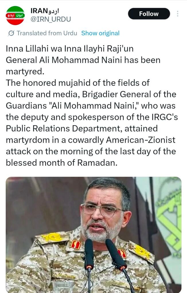 तेहरान/वॉशिंगटन। मध्य-पूर्व में बढ़ते तनाव के बीच शुक्रवार सुबह एक बड़ा दावा सामने आया है। विभिन्न अनौपचारिक रिपोर्ट्स में कहा जा रहा है कि Islamic Revolutionary Guard Corps (IRGC) के प्रवक्ता जनरल अली मोहम्मद नैनी की कथित अमेरिका-इज़रायल मिसाइल हमले में मौत हो गई है।