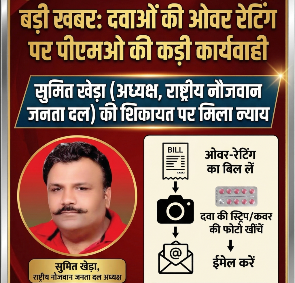 मुज़फ्फरनगर। राष्ट्रीय नौजवान जनता दल के अध्यक्ष सुमित खेड़ा की शिकायत पर पीएमओ ने जीवन रक्षक दवाओं की ओवररेटिंग के मामले को गंभीरता से लेते हुए विस्तृत स्तर पर कार्रवाई के निर्देश दिए हैं। इस संबंध में प्रशासनिक सुधार एवं लोक शिकायत विभाग द्वारा जारी पत्र में दवा कीमत नियंत्रण और उपभोक्ता अधिकारों को लेकर स्पष्ट दिशा-निर्देश दिए गए हैं।