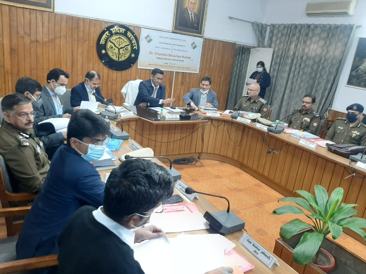 भारत निर्वाचन आयोग के उप निर्वाचन आयुक्त डा. चन्द्र भूषण कुमार ने सोमवार को कमिश्नरी सभागार में मेरठ, सहारनपुर व मुरादाबाद मंडल के 14 जिलों के अंतर्गत आने वाली 71 विधानसभा में आगामी विधानसभा चुनाव के दृष्टिगत की जा रही तैयारियों की समीक्षा की। उन्होंने बताया कि आगामी दिनों में भारत निर्वाचन आयोग में भी सभी जिला निर्वाचन अधिकारियों की बैठक होगी, जिसमें जिला निर्वाचन अधिकारियों द्वारा प्रस्तुतीकरण दिया जायेगा। भारत निर्वाचन आयोग द्वारा 70 वर्षों में अब तक करीब 17 लोकसभा, 375 विधानसभा, उप चुनाव, एमएलसी चुनाव आदि कराये हंै। उन्होने सभी जिला निर्वाचन अधिकारियों व पुलिस अधिकारियों से कहा कि निष्पक्ष, पारदर्शी व सुचितापूर्ण ढ़ग से निर्वाचन को संपन्न कराये। मतदाता सूची (वोटर लिस्ट) का सही, पारदर्शी व साफ-सुथरा होना अत्यंत आवश्यक है। मतदाता सूची प्रजातंत्र के लिए एक महत्वपूर्ण कड़ी है। जो भी वोटर बनने का पात्र है, उसका नाम मतदाता सूची में अवश्य हो। यह सुनिश्चित किया जाये कि कोई भी मतदाता अपने मताधिकार से वंचित न रहे। निर्वाचन से जुड़े सभी अधिकारियों व कर्मचारियों को कोविड-19 डबल वैक्सीनेटेड हो इसको सुनिश्चित किया जाए। मुख्य निर्वाचन अधिकारी उप्र अजय कुमार शुक्ला ने कहा कि मतदान लोकतंत्र का उत्सव है। इसलिए सभी जिला निर्वाचन अधिकारी व पुलिस अधिकारी पूरी तैयारी व आयोग की मंशा के अनुरूप चुनाव संपन्न कराये। निदेशक व्यय, भारत निर्वाचन आयोग पंकज श्रीवास्तव ने कहा कि जिला निर्वाचन अधिकारी एक्सपेन्डिीचर सेन्सिटिव विधानसभा को चिन्हित करें। पुलिस महानिरीक्षक अपराध उप्र डा. संजीव गुप्ता ने कहा कि जिला निर्वाचन अधिकारी व पुलिस अधिकारी वलरेनेबिलिटी मैपिंग की भी सुपर चेकिंग करें।